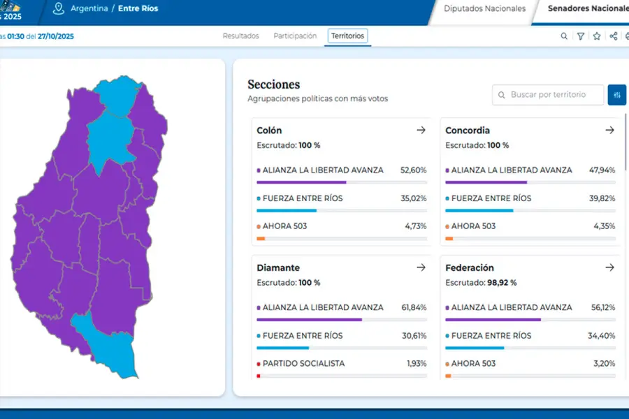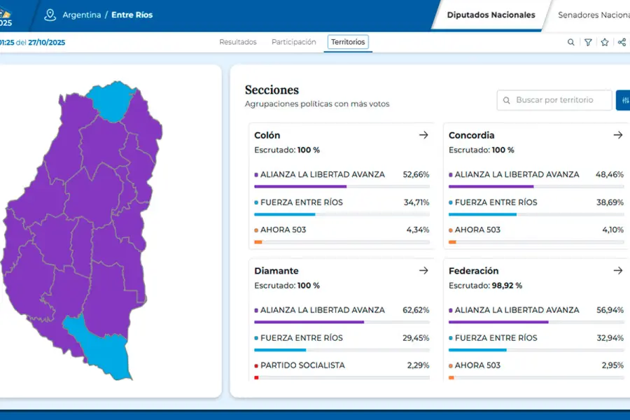 Los datos oficiales reflejaban que la Alianza La Libertad Avanza obtuvo 399.992 votos, lo que representa 52,47% de los sufragios emitidos en Entre Ríos; mientras que Fuerza Entre Ríos sumó 271.818 votos, que significan el 35,66 %.