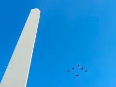 Son parte del lote de los 24 aviones que el Gobierno le compró a Dinamarca. Este sábado los F-16 llegaron a Capital Federal y realizaron un vuelo rasante por el Obelisco y Casa Rosada.