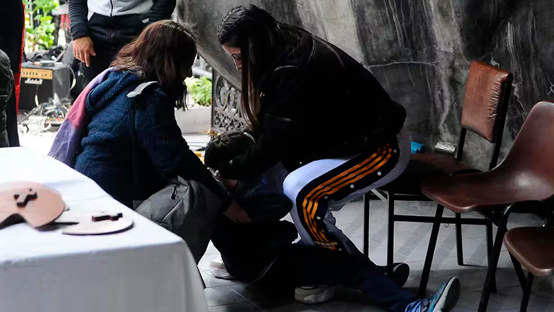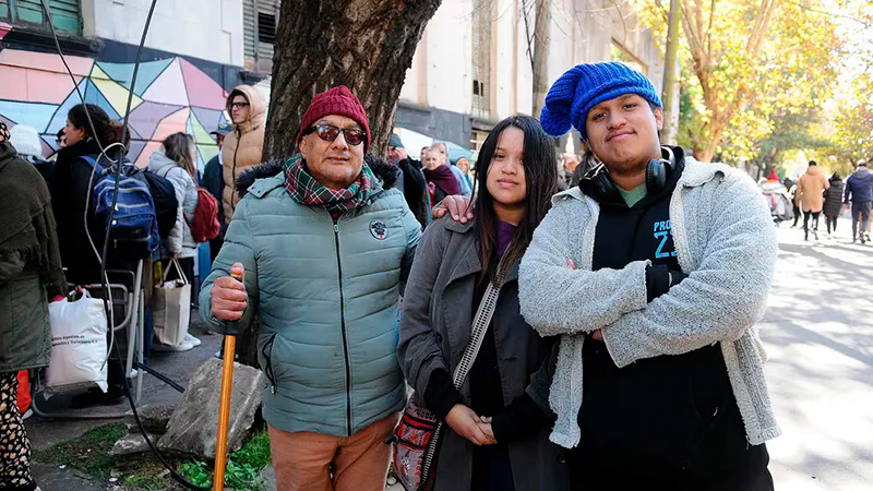 Ya dentro del predio, Jorge, de 36, albañil, atiende a su hijo Joaquín, de 14: con una cánula, drena su flema por un orificio en el cuello. Está junto a su esposa, Liliana y su otra hija, Camila, de 2. Todos abrigadisimos. Joaquín aguarda en una silla de ruedas especial. La familia es de Comodoro Rivadavia, pero desde hace cinco meses habitan en Buenos Aires, gracias a que su obra social, OSECAC, les consiguió un hotel para que el chico se trate del Síndrome de Sanfilippo -una enfermedad degenerativa metabólica- que padece. Hace un mes salió de alta de su internación, pero aún está en tratamiento. Como muchos de los que están acá, conocen a Leda por la tele. Y como todos, le tienen fe.