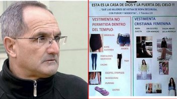 Carlos Scarlata prohibió a las mujeres de cualquier edad, asistir a la iglesia con shorts, jeans ajustados, minifaldas o calzas. "Con qué intención se pone eso?", se pregunta. Pegó un afiche con la "vestimenta cristiana femenina".