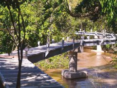 En otras partes son sólo largos tablones sobre la estructura tubular, que arman un estrecho sendero sobre el agua que corre rojiza y burbujeante sin cesar uno o dos metros más abajo, no apto para quien sufra de vértigo ya que los listones son flexibles y se sacuden según el peso de quien camina sobre ellos.