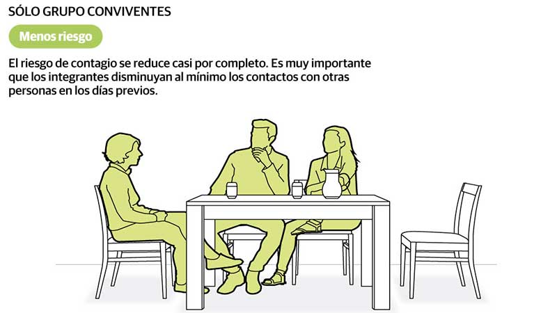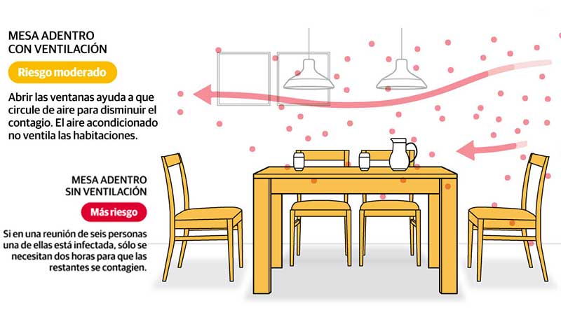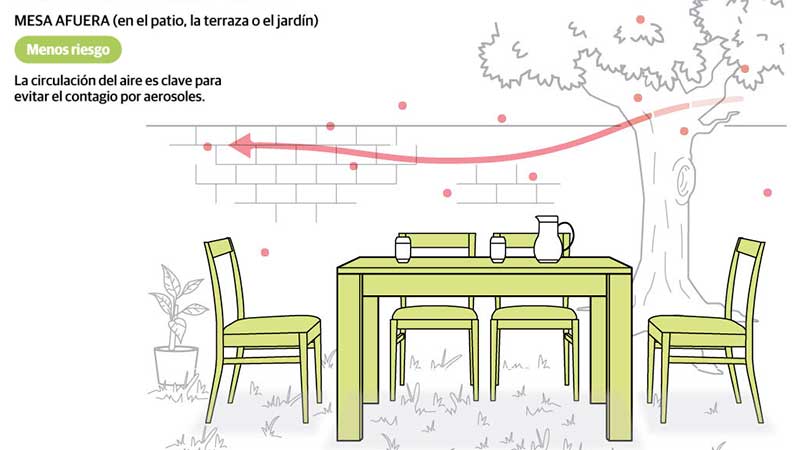 Para ambos investigadores, garantizar que la cena sea al aire libre es la medida más importante para reducir el contagio por aerosoles. Si no se puede, hay que abrir ventanas y puertas para ventilar. La segunda medida en importancia es el uso del barbijo.