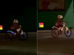 En medio de la oscuridad nocturna, a la distancia se distinguía la silueta del niño avanzando en bicicleta, rodeado de luces. Su andar tranquilo y constante llamó la atención de vecinos que se detuvieron a observar, sorprendidos por la ternura del gesto y el mensaje implícito que transmitía.