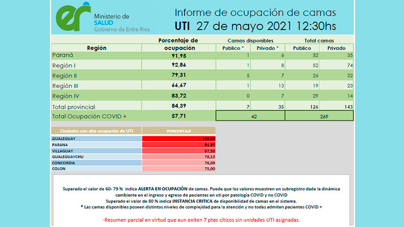 La ciudad de Gualeguay, en tanto, presenta un nivel todavía más grave: la ocupación es del 100% y ya no hay camas libres en unidades de terapia intensiva, en el marco de una segunda ola de coronavirus que tornó crítica la situación sanitaria de la provincia.