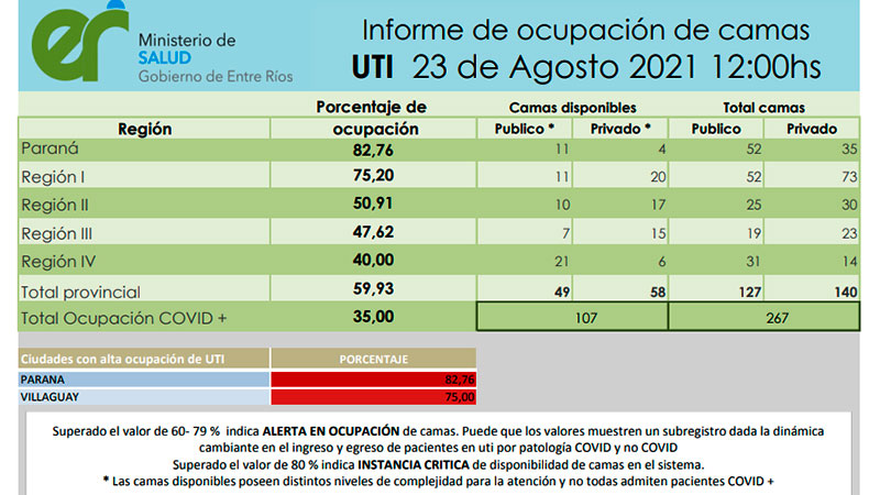 El informe determina que hay dos ciudades de la provincia que tienen un elevado nivel de ocupación de camas de terapia intensiva: Paraná (82,76%) está en un nivel crítico y Villaguay (75%) sigue en alerta.