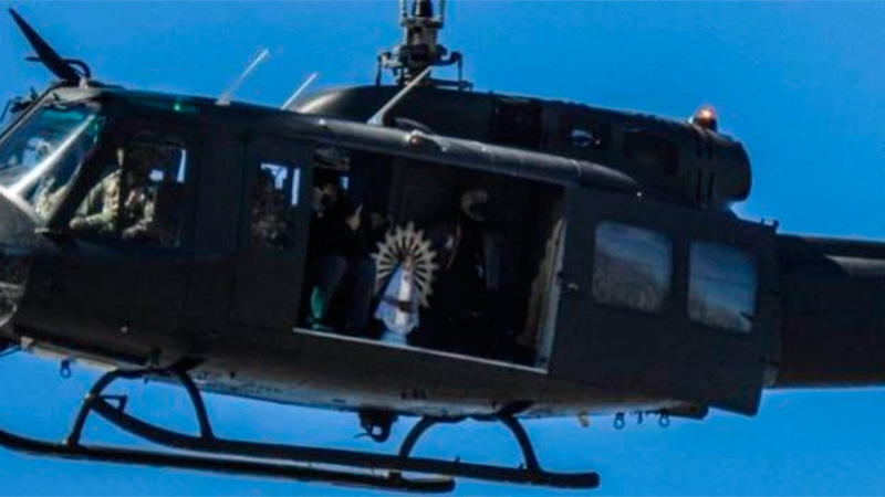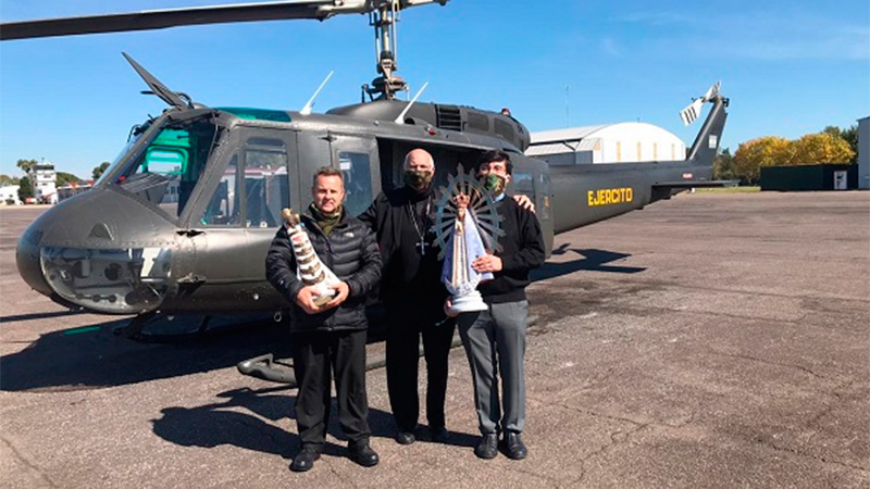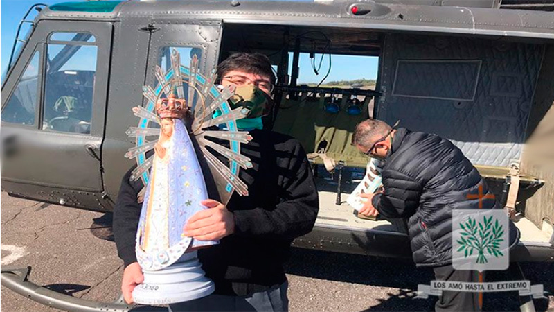 El helicóptero B Helic Asal 601 del Ejército Argentino partió de Campo de Mayo llevando las imágenes de la Virgen de Loreto, patrona del Ejército de los Cielos, y la Virgen de Luján, "Peregrina de la Paz", que acompañó a los soldados en la guerra de Malvinas y hace 5 meses fue restituida a la Argentina tras haber estado casi cuatro décadas en la catedral castrense del Reino Unido.
