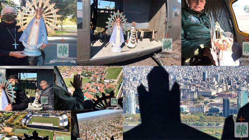 Un helicóptero con las imágenes de la Nuestra Señora de Loreto y Nuestra Señora de Luján de Malvinas, llevadas por el obispo castrense, monseñor Santiago Olivera, sobrevoló este domingo las zonas más afectadas por el coronavirus, para bendecir a los argentinos en medio de la pandemia.