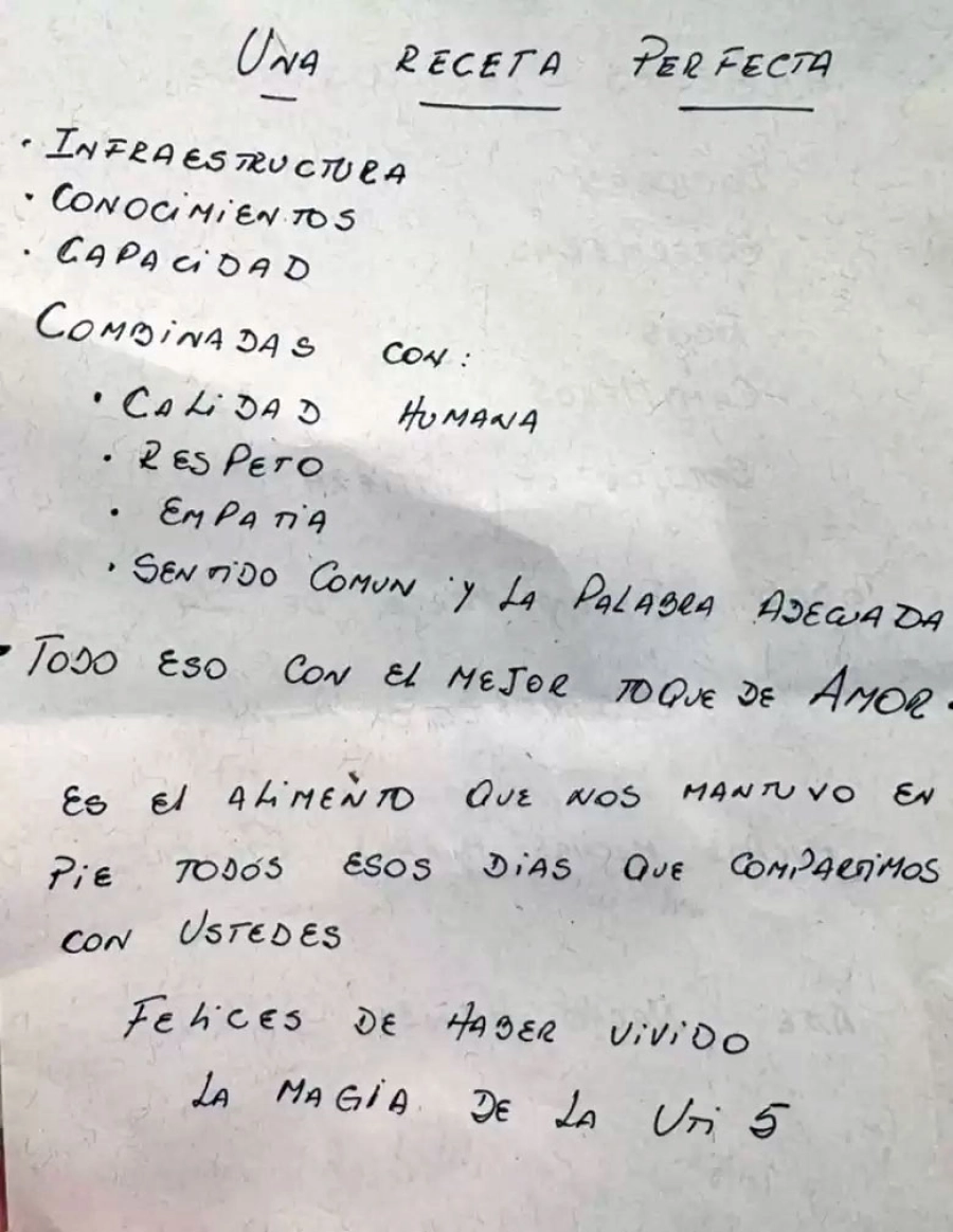 En la misma destaca la atención de los médicos, enfermeros y el resto de los trabajadores que lo acompañaron a él y su familia en un momento difícil.