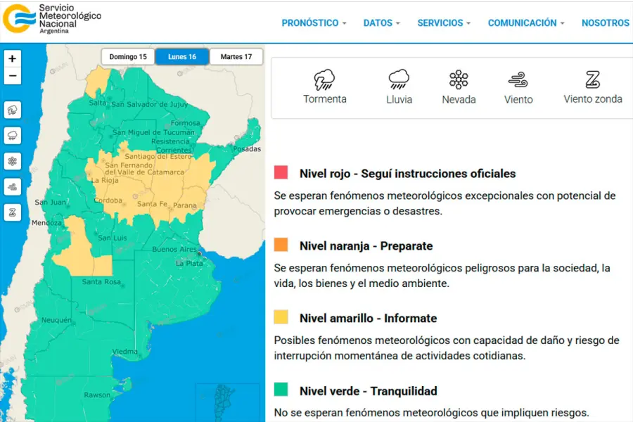 El organismo mantiene vigente, desde esta mañana y hasta la tarde de este domingo, el aviso de alerta por tormentas para Entre Ríos, y las provincias de Santa Fe, zonas de Corrientes, parte de Buenos Aires, Córdoba, Santiago del Estero, La Rioja, Catamarca, Mendoza, San Luis y parte de Jujuy.