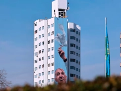 El mural, de 50 metros de alto por apenas cinco de ancho, presentó complejidades técnicas significativas. “Era una pared muy difícil por su verticalidad. La imagen elegida resuelve todo: tiene una cinta larga, una cruz, un brazo que sale del plano y se conecta con el cielo”, detalló el artista, que lideró un equipo de cinco personas durante 20 días de trabajo ininterrumpido.