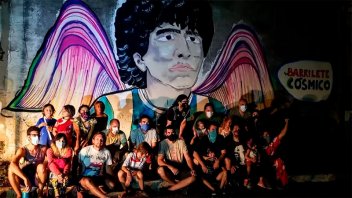 En la esquina de Alberdi y Goldaracena, en unos de los muros del viejo Molino, un grupo de personas homenajeó a Diego Armando Maradona pintando un mural.