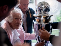 Tras el campeonato, jugadores del Calamar se acercaron al geriátrico donde se encuentra la mujer de 98 para llevarle el trofeo y le regalaron una camiseta.