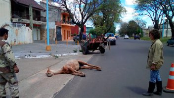 <b>El joven animal cayó exhausto cuando tiraba un carro con más de 150 ladrillos. A raíz de este hecho, se hizo la denuncia penal contra las dos personas mayores de edad que iban en el carro</b> y quedaron imputados por infracción a la ley 14.335 de Maltrato Animal.