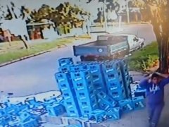 Una cámara de seguridad captó un verdadero desastre: un joven empleado de una empresa distribuidora de bebidas protagonizó un accidente que terminó con decenas de botellas de cerveza rotas y derramadas en la calle.