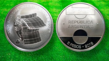 En el reverso está representado parte de un campo de juego, con la leyenda "República Argentina", flanqueada por dos estrellas que simbolizan los triunfos argentinos en los campeonatos mundiales de 1978 y 1986, agregó.
