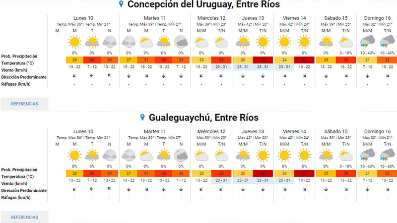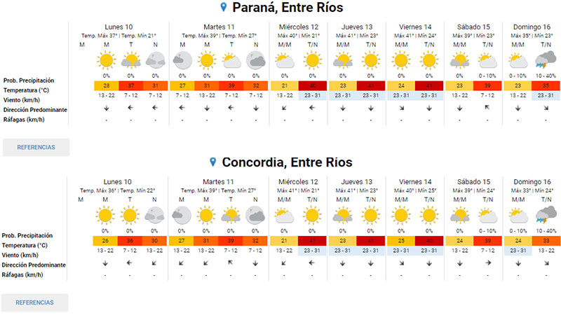 En Santa Fe, mientras las marcas mínimas rondarán los 21 grados, las máximas previstas estarán entre los 37 y 39 grados, mientras que en Santiago del Estero rondarán entre los 39 y 42 grados, con mínimas de 22 y 24.