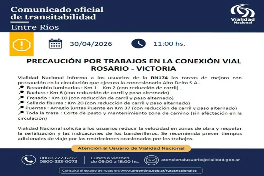Vialidad Nacional advirtió a los conductores que transitan por el puente Victoria-Rosario sobre la presencia de trabajos de mantenimiento en distintos sectores de la Ruta Nacional 174, lo que genera restricciones en la circulación.