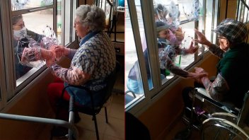 El hospital geriátrico Domingo Cúneo de la ciudad de Victoria habilitó nuevamente este martes las visitas mediadas por una mampara intervenida (de policarbonato con mangas transparentes) para que los familiares puedan mantener contacto con sus adultos mayores.