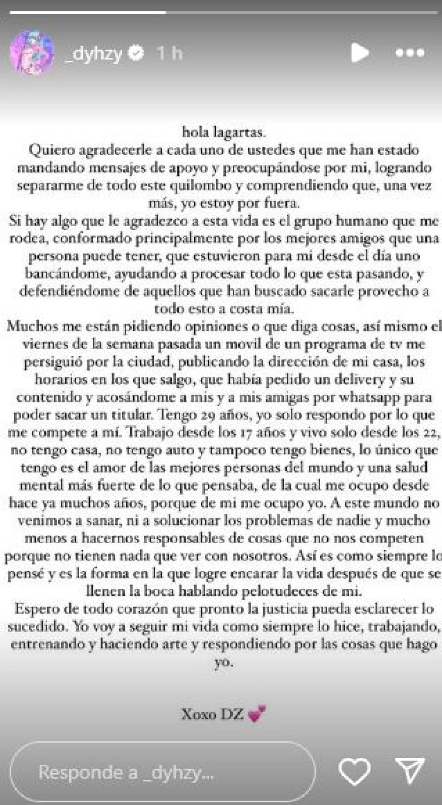 “Quiero agradecerle a cada uno de ustedes que me han estado mandando mensajes de apoyo y preocupándose por mí, logrando separarme de todo este quilombo y comprendiendo que, una vez más, yo estoy por fuera”, comenzó.
