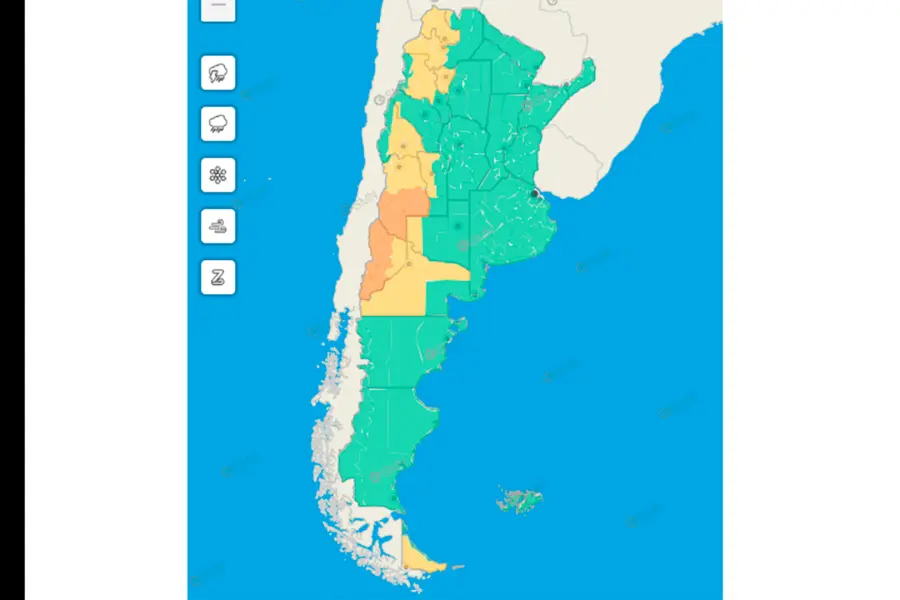 El fenómeno de tormentas, con posible caída de granizo y que subía a alerta naranja en algunas zonas, afectará a regiones de las provincias de Jujuy, Salta, Tucumán, Catamarca, San Juan, Mendoza, San Luis, La Pampa, Neuquén y Río Negro.