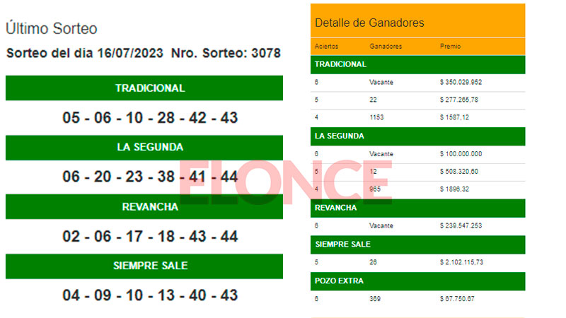 En el caso de La Segunda los números favorecidos fueron 23-44-41-38-20-06. No hubo ganadores en este sorteo y para el próximo se acumulan $100.000.000.