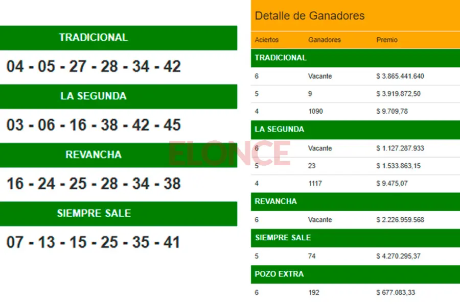 En el Tradicional salieron el 34-02-42-04-28-27. Ningún apostador acertó todos los números y el pozo quedó vacante. Acumula para el próximo sorteo $3.865.441.640.