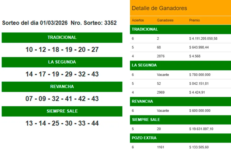 En el Tradicional salieron el 27-12-10-19-20-18. Hubo dos afortunados que acertaron los seis números y cada uno embolsará $4.111.205.050,58. Uno es oriundo en la localidad de Muñiz, en la provincia de Buenos Aires, y el otro es de Cosquín, en la provincia de Córdoba.