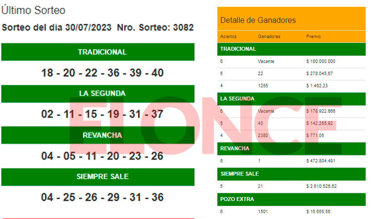 En el Tradicional salieron el 39-36-18-20-40-22. Ningún apostador acertó todos los números y el pozo quedó vacante. Acumula para el próximo sorteo $100.000.000.