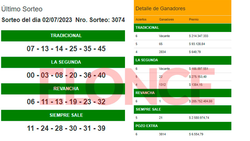 En el Tradicional salieron el 25-13-07-45-35-14. Ningún apostador acertó todos los números y el pozo quedó vacante. Acumula para el próximo sorteo $214.347.333.