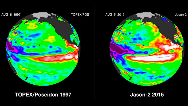 <b>Foto</b>: <i>Comparación de la temperatura del océano Pacífico entre 1997 (izquierda) y 2015 (derecha) (Nasa)</i>