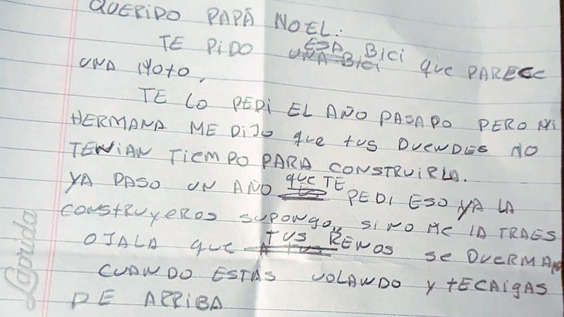<i>"Querido Papá Noel: Te pido esa bici que parece una moto. Te lo pedí el año pasado pero mi hermana me dijo que tus duendes no tenían tiempo para construirla. Ya pasó un año que te pedí eso, ya la construyeron supongo. Si no me la traés, ojalá que tus renos se duerman cuando estás volando y te caigas de arriba"</i>, escribió el pequeño Eloy.