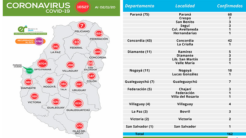 La provincia sumó un total de 16.527 casos de coronavirus este lunes, al reportarse 162 positivos en diez departamentos. <b>Paraná, Diamante, Federación y Gualeguaychú sumaron 98 del total. El detalle del informe</b>.