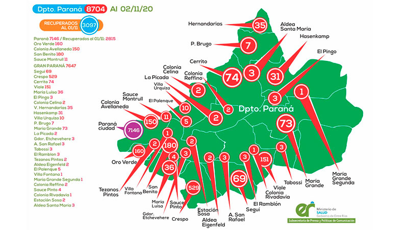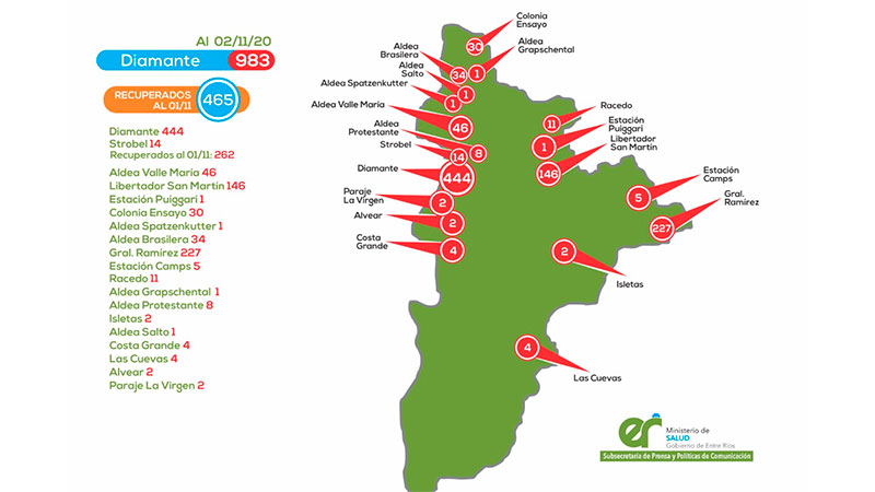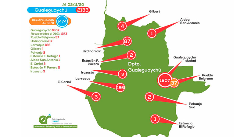 Mientras que <b>Gualeguaychú, ya suma 2.133 casos</b>. En tanto, <b>Diamante</b>, es el tercer departamento, respecto a la acumulación de casos de coronavirus, y ya cuenta con <b>983 positivos</b>. Además, el departamento <b>Federación, ya alcanza los 824 positivos</b>.