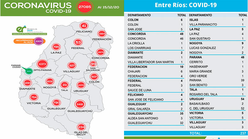 La provincia sumó un total de 27.085 casos de coronavirus este martes, al reportarse 237 positivos en 16 departamentos. <b>Paraná, Diamante, Concordia, Federación y Gualeguaychú sumaron 143 del total. El detalle del informe</b>.