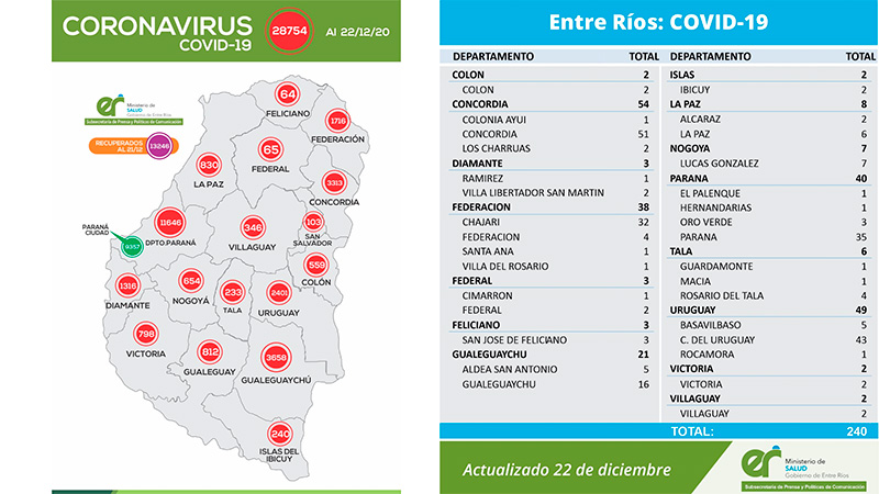 Se registraron 240 nuevos casos de coronavirus este martes en 15 departamentos de Entre Ríos. La mayor cantidad de positivos se registró en Concordia, Uruguay, Federación y Paraná.