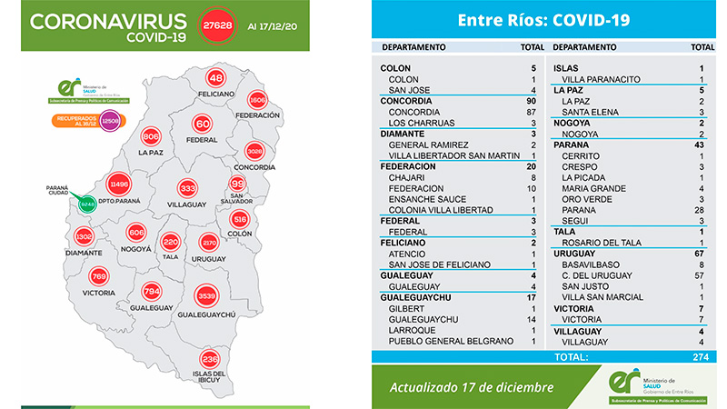 El área de Vigilancia Epidemiológica del Ministerio de Salud, confirmó que en Entre Ríos este jueves se registraron 274 nuevos casos de coronavirus. De acuerdo a los datos a los que accedió <i>Elonce,</i> Concordia, Uruguay y Paraná fueron los departamentos que más positivos sumaron en la jornada.
