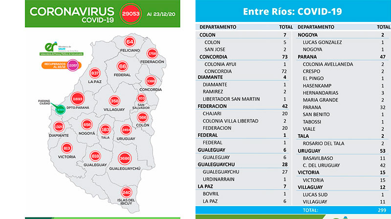 El área de Vigilancia Epidemiológica del Ministerio de Salud, confirmó que en Entre Ríos este miércoles se registraron 299 nuevos casos de coronavirus. Concordia, Uruguay, Federación y Paraná fueron los departamentos que más casos positivos sumaron.