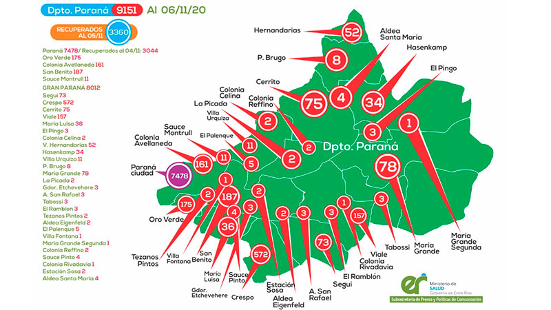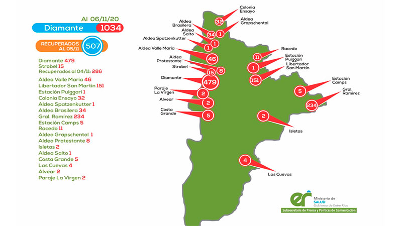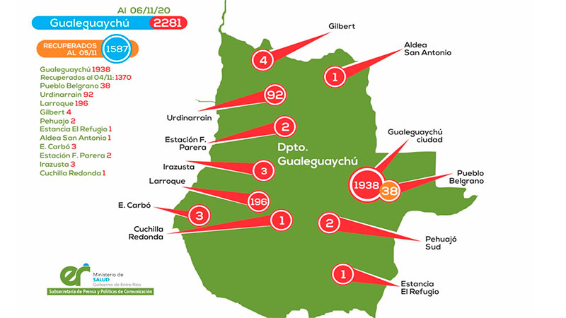 Mientras que <b>Gualeguaychú, ya suma 2.281 casos</b>. En tanto, <b>Diamante</b>, es el tercer departamento, respecto a la acumulación de casos de coronavirus, y ya cuenta con <b>1.034 positivos</b>.