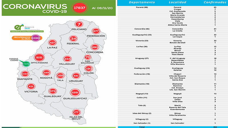 La provincia sumó un total de 17.837 casos de coronavirus este viernes, al reportarse 352 positivos en quince departamentos. <b>Paraná, Diamante, Concordia, Federación y Gualeguaychú sumaron 203 del total. El detalle del informe</b>.