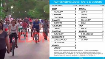 El área de Vigilancia Epidemiológica de Entre Ríos, confirmó este jueves, que se registraron 57 nuevos casos de coronavirus durante las últimas 72 horas. De ese modo, son 137.723 los positivos confirmados en la provincia. Según el reporte del Ministerio de Salud , once departamentos sumaron positivos, durante los días martes 5, miércoles 6 y jueves 7 de octubre.