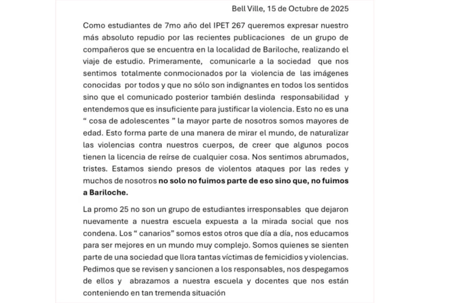 Expresaron que esta conducta forma parte de “una manera de mirar el mundo, de naturalizar las violencias contra nuestros cuerpos, de creer que algunos pocos tienen la licencia de reírse de cualquier cosa”. Advirtieron que, más allá del viaje, muchos estudiantes no participaron ni viajaron, pero igualmente están siendo señalados.