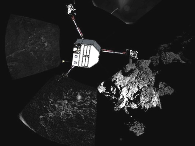 En la fotografía panorámica, compuesta por dos imágenes, se puede ver que el módulo Philae se encuentra a salvo sobre la superficie del cometa 67/P Churyumov-Gerasimenko, según confirmó la ESA.