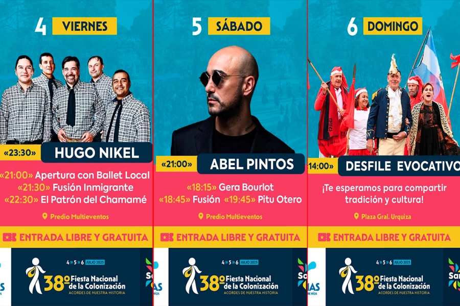 La Fiesta Nacional de la Colonización se realizará entre el viernes 4 y el domingo 6 de julio con entrada gratuita. Tendrá torneo de pesca, maratón, el tradicional y colorido desfile, la Noche de Peñas, el sábado lo cierra Abel Pintos y el domingo habrá una noche a pura Cumbia.