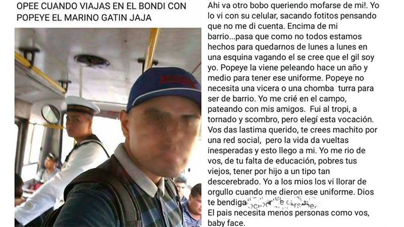 Se sacó una selfie y lo trató de "Popeye". El mensaje del marino se volvió viral. Un joven publicó en su Facebook una foto donde se burlaba del uniforme de un integrante de la Armada Argentina tratándolo de "Popeye el Marino".