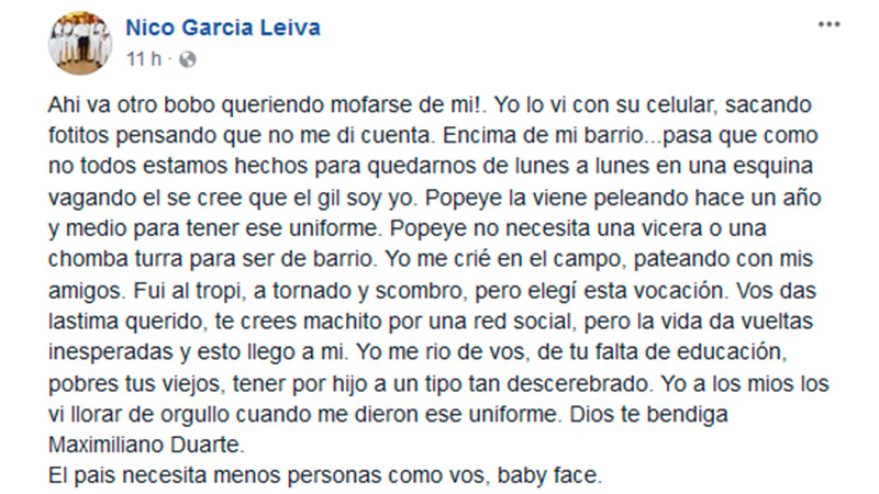 Días después y por el mismo medio, el agredido le respondió con un duro y emotivo mensaje: "Yo a los míos los vi llorar cuando me dieron ese uniforme".