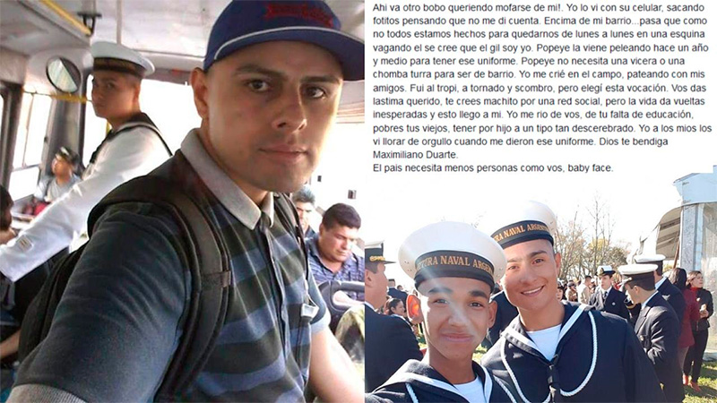 Un joven publicó una foto donde se burlaba de un integrante de la Armada, tratándolo de "Popeye el Marino". El agredido le respondió con un emotivo mensaje: "Yo a los míos los vi llorar cuando me dieron ese uniforme".