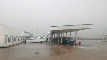 El techo de una estación de servicios ubicada en la zona de Colonia Elia se desplomó al ceder la estructura producto de la fuerza del viento desatado al comenzar la tormenta que atraviesa el territorio entrerriano.