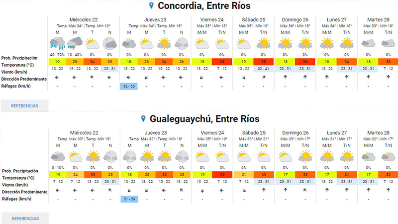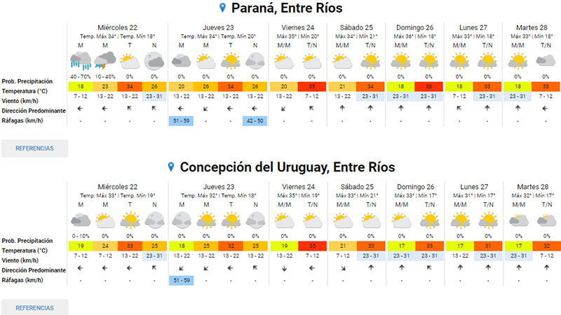 En el caso de Entre Ríos, se esperan para hoy vientos regulares a débiles del sudeste y este. Nublado, alto porcentual de la humedad, inestable y probabilidad de precipitaciones con algunas tormentas dispersas” en las primeras horas del día. Luego se produciría una disminución de la nubosidad, por lo que estará caluroso por la tarde con alta sensación térmica, al tiempo que no descartan ocasionales chaparrones muy aislados hacia la noche. Las temperaturas máximas rondarían los 35 grados.