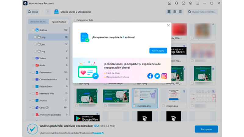 4. Previsualizá y seleccioná los archivos a recuperar. Terminado el escaneo, Recoverit mostrará una lista de todos los archivos encontrados. Podés previsualizar los archivos antes de recuperarlos para asegurarte de que son los que estás buscando. Usá los filtros para facilitar la búsqueda de archivos específicos.