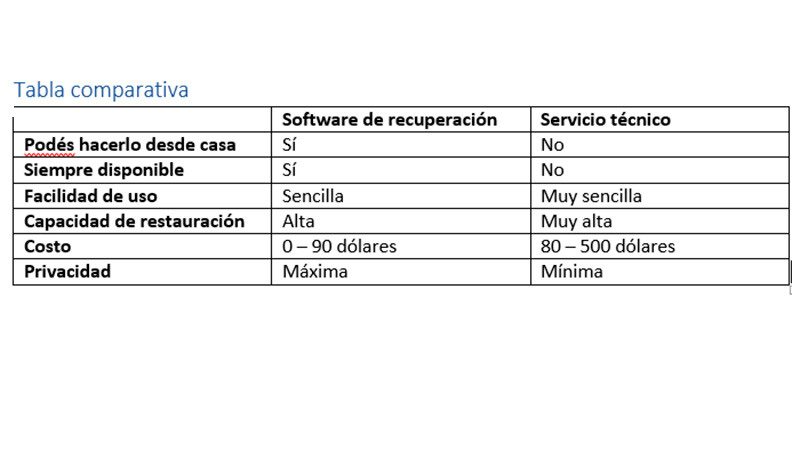 Como ves, tenés dos opciones bastante asequibles para restaurar tus datos eliminados en cualquier computadora o cualquier celular. La alternativa aparentemente más cómoda –la del servicio técnico– también es la más lenta y la más cara, así que ¿hasta qué punto puede resultarte conveniente? Puede ser tu opción si no cuentas con ningún conocimiento informático, pero, a poco que sepas manejar una computadora, ya no te hace falta.